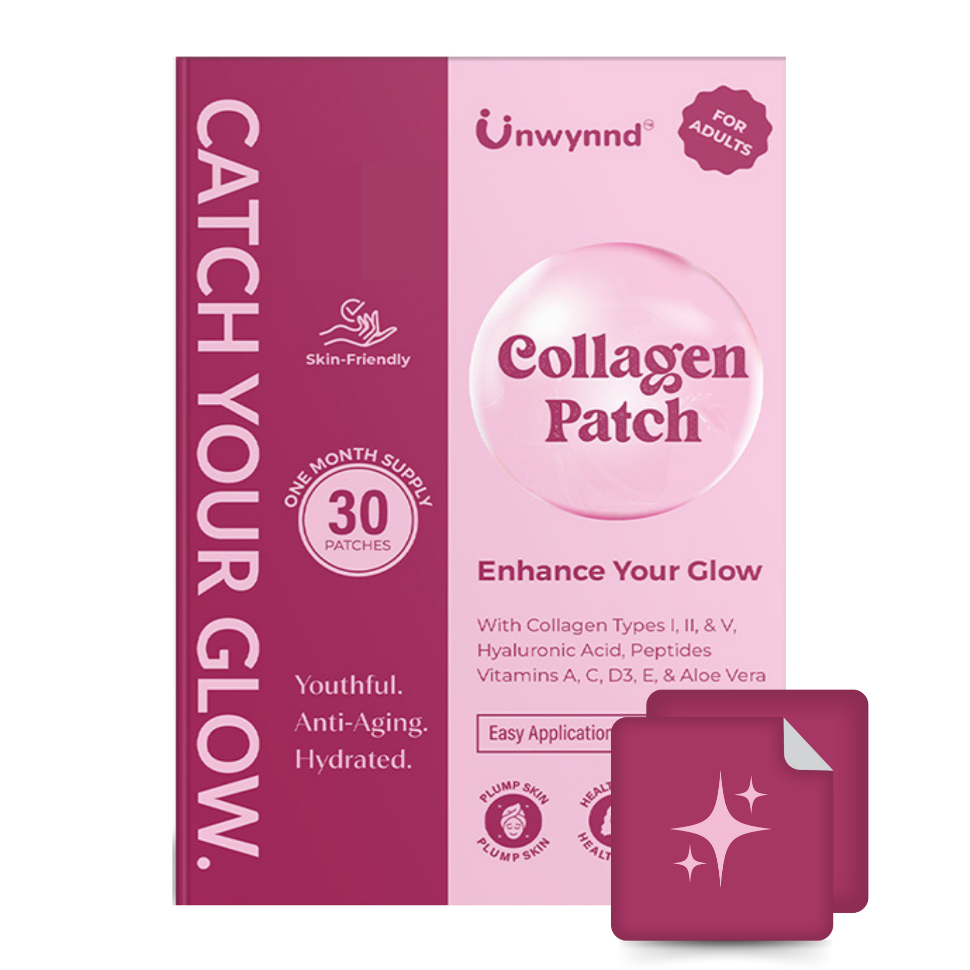 Marine Collagen Peptides Blend For Youthful Radiance: Unwynnd Collagen Patches with Types 1, 2, & 5 Marine Collagen, Hyaluronic Acid, & Vitamin C help achieve radiant skin, support joint health, promote hair & nail growth, and improve skin hydration for plumping effect.